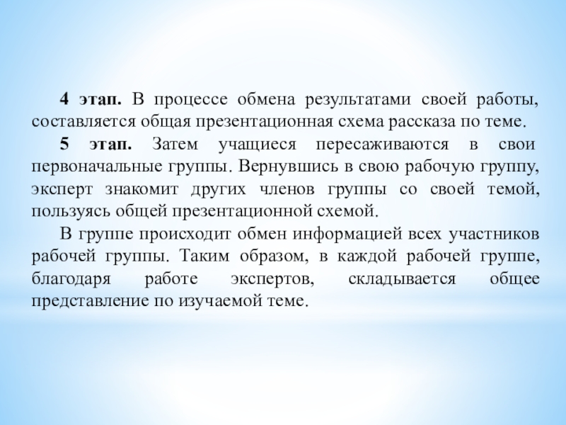 5 этап. Затем учащиеся пересаживаются в свои первоначальные группы. Вернувшись в свою рабочую группу, эксперт знакомит других членов группы со своей темой, пользуясь общей презентационной схемой.