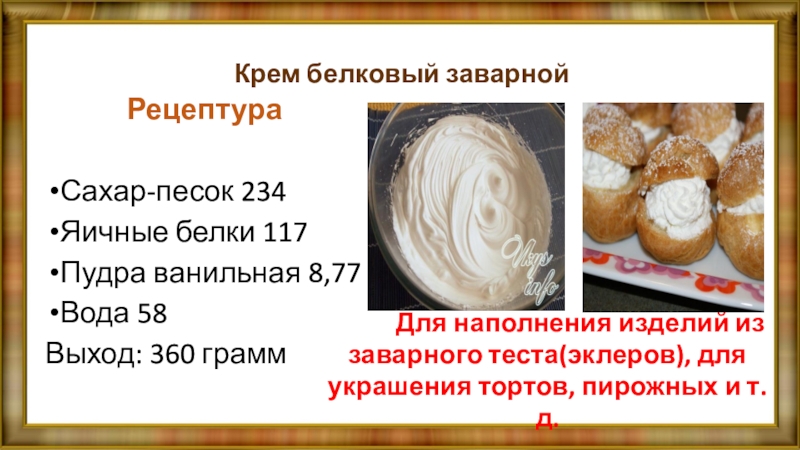 Для наполнения изделий из заварного теста(эклеров), для украшения тортов, пирожных и т.д.
