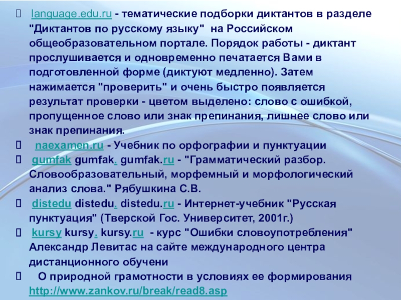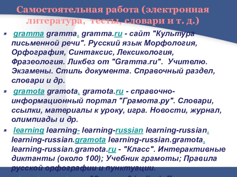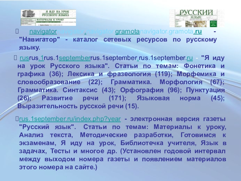 rusrus.1rus.1septemberrus.1september.rus.1september.ru - "Я иду на урок Русского языка". Статьи по темам: Фонетика и графика (36); Лексика и фразеология (119); Морфемика и словообразование (22); Грамматика. Морфология (67); Грамматика. Синтаксис (43); Орфография (96); Пунктуация (26); Развитие речи (171); Языковая норма (45); Выразительность русской речи (15).
