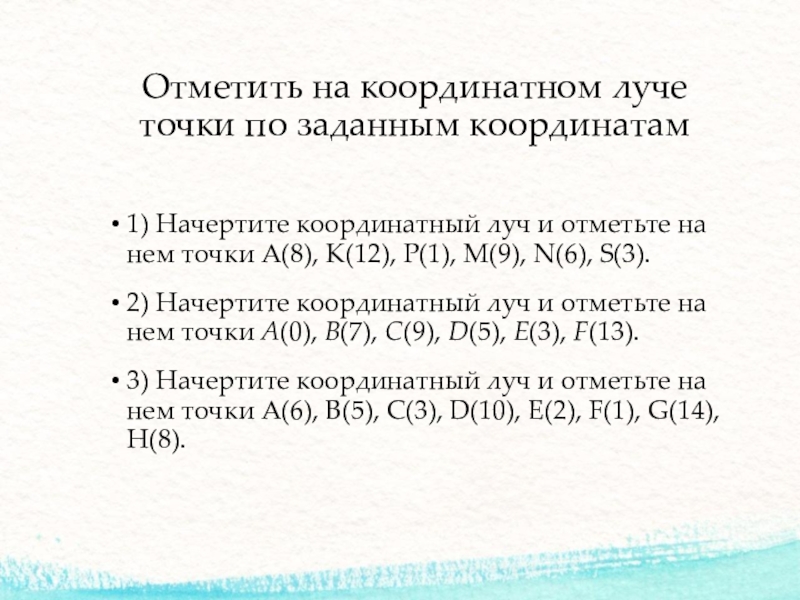 Слайд 10Отметить на координатном луче точки по заданным координатам