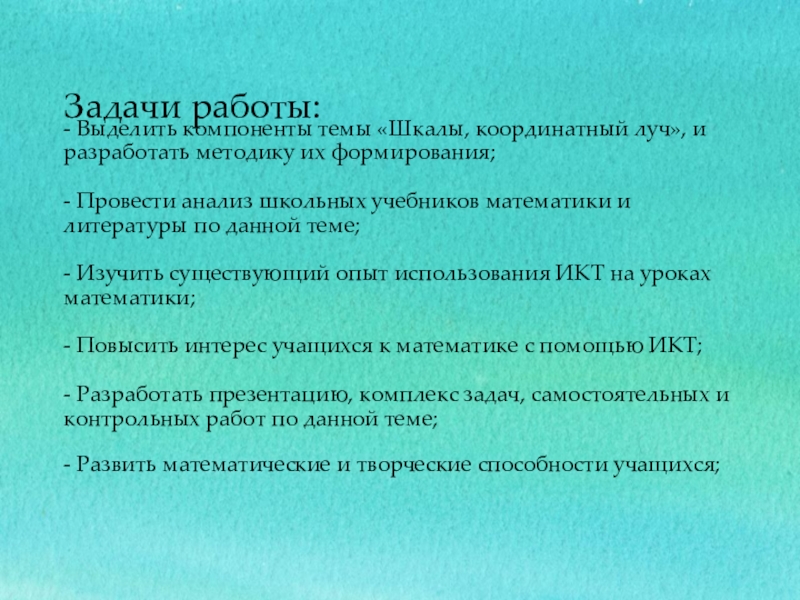 Цель работы: разработать методику изучения и использования темы шкалы и координатный луч с использованием икт на уроках математики в основной школе.
