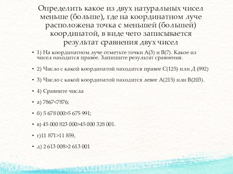 Определить какое из двух натуральных чисел меньше (больше), где на координатном луче расположена точка с меньшей (большей) координатой, в виде чего записывается результат сравнения двух чисел.