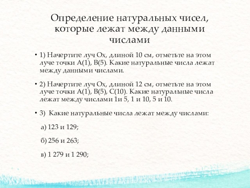 длиной 10 см, отметьте на этом луче точки А(1), В(5). Какие натуральные числа лежат между данными числами.