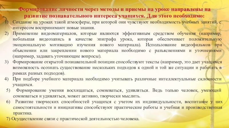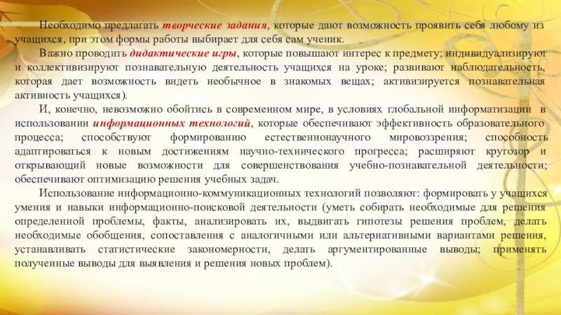 мышление должно главенствовать над памятью, учебная информация распределена на крупные блоки, материал дается большими дозами