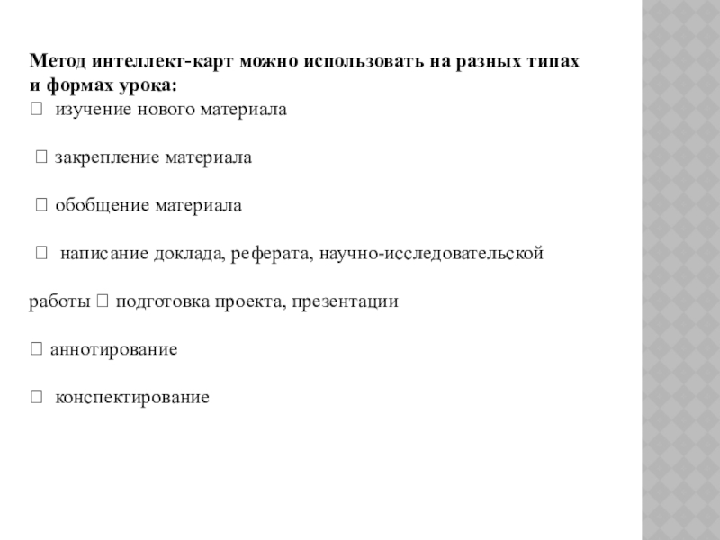 Слайд 9Метод интеллект-карт можно использовать на разных типах и формах урока: