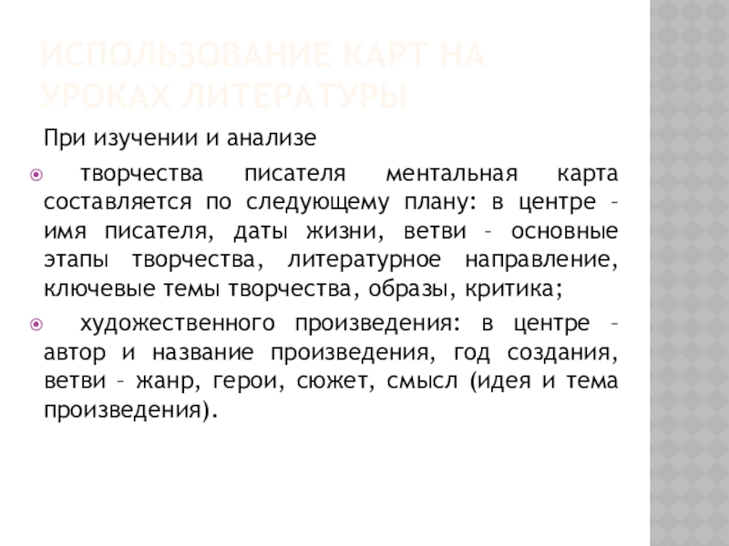 карта составляется по следующему плану: в центре – имя писателя, даты жизни, ветви – основные этапы творчества, литературное направление, ключевые темы творчества, образы, критика;