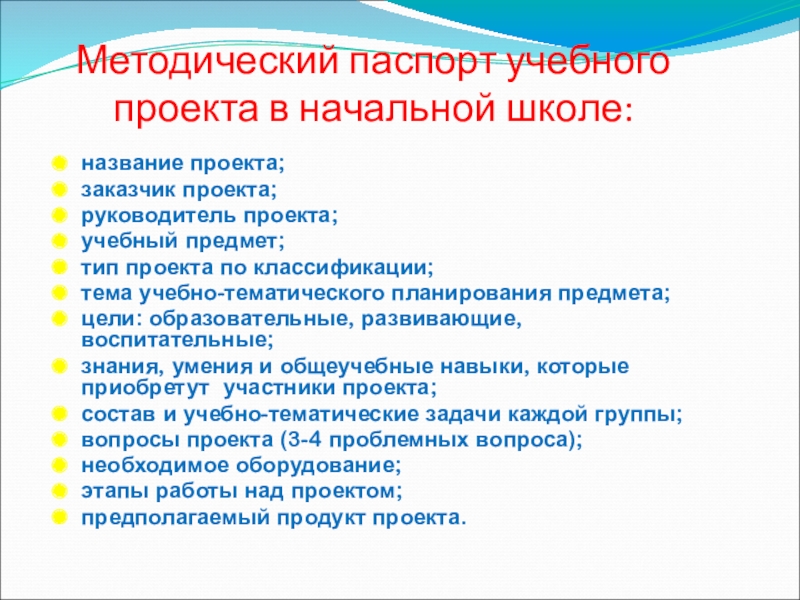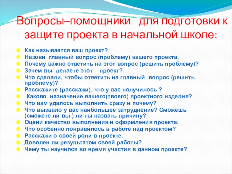 Слайд 15 Вопросы–помощники для подготовки к защите проекта в начальной школе: