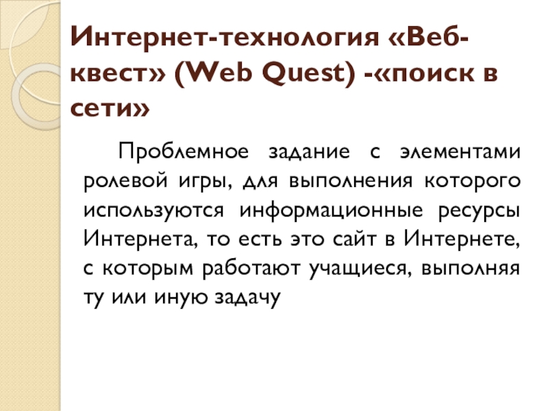 Слайд 30Интернет-технология «Веб-квест» (Web Quest) -«поиск в сети»