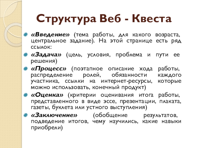 «Процесс» (поэтапное описание хода работы, распределение ролей, обязанности каждого участника, ссылки на интернет-ресурсы, которые можно использовать, конечный продукт)
