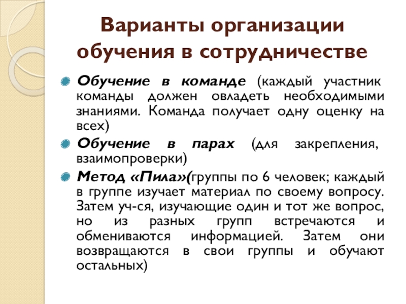 Метод «Пила»(группы по 6 человек; каждый в группе изучает материал по своему вопросу. Затем уч-ся, изучающие один и тот же вопрос, но из разных групп встречаются и обмениваются информацией. Затем они возвращаются в свои группы и обучают остальных)