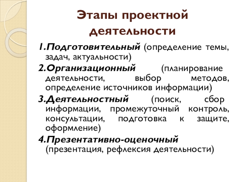 3.Деятельностный (поиск, сбор информации, промежуточный контроль, консультации, подготовка к защите, оформление)