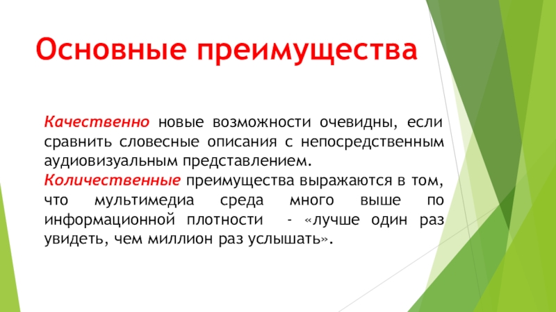 Количественные преимущества выражаются в том, что мультимедиа среда много выше по информационной плотности - «лучше один раз увидеть, чем миллион раз услышать».