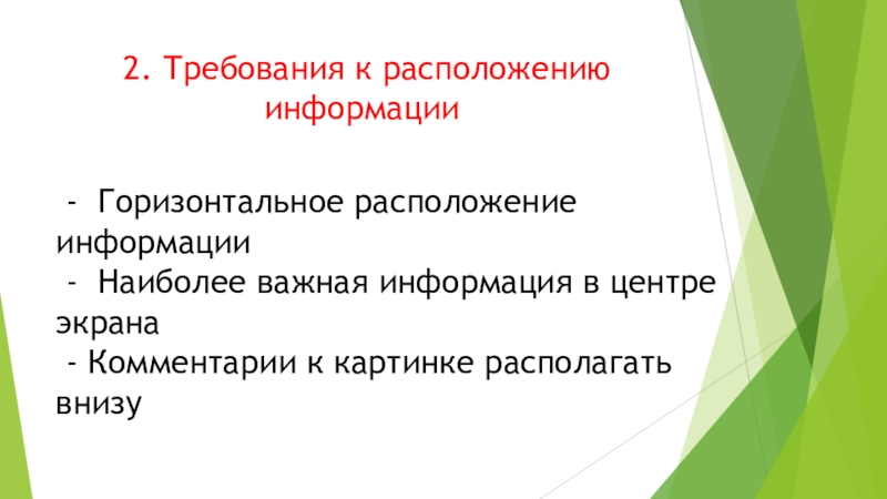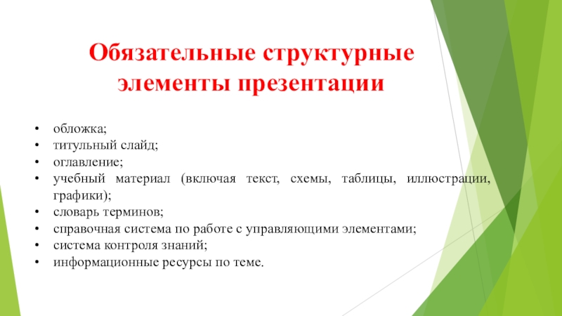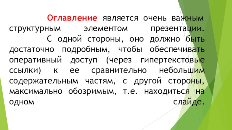 С одной стороны, оно должно быть достаточно подробным, чтобы обеспечивать оперативный доступ (через гипертекстовые ссылки) к ее сравнительно небольшим содержательным частям, с другой стороны, максимально обозримым, т.е. находиться на одном слайде.