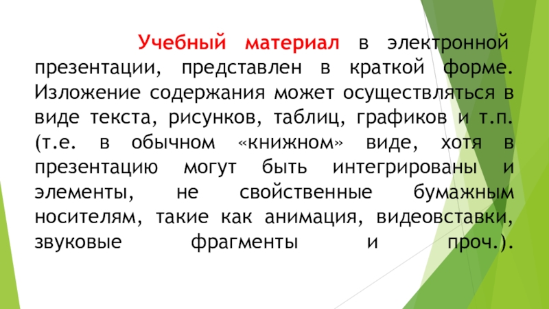 Слайд 23 Учебный материал в электронной презентации, представлен в краткой