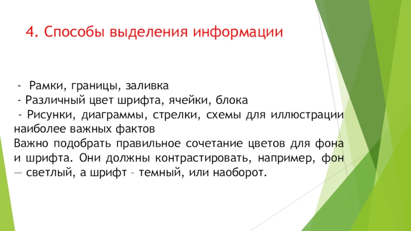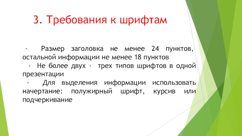 - Для выделения информации использовать начертание: полужирный шрифт, курсив или подчеркивание