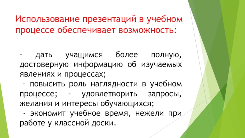 Слайд 4Использование презентаций в учебном процессе обеспечивает возможность: