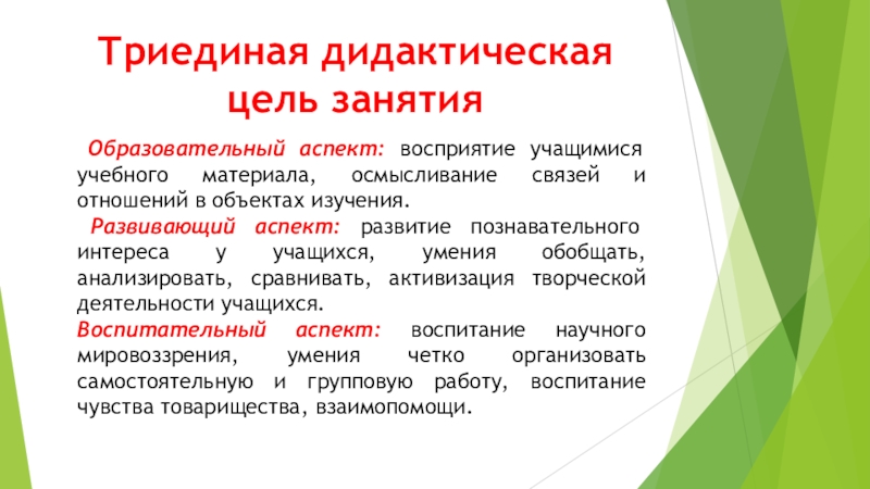 Воспитательный аспект: воспитание научного мировоззрения, умения четко организовать самостоятельную и групповую работу, воспитание чувства товарищества, взаимопомощи.