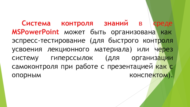 организована как эспресс-тестирование (для быстрого контроля усвоения лекционного материала) или через систему гиперссылок (для организации самоконтроля при работе с презентацией как с опорным конспектом).