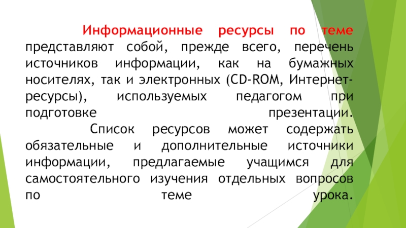 Список ресурсов может содержать обязательные и дополнительные источники информации, предлагаемые учащимся для самостоятельного изучения отдельных вопросов по теме урока.