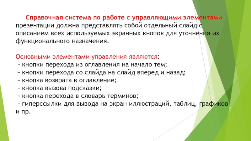 должна представлять собой отдельный слайд с описанием всех используемых экранных кнопок для уточнения их функционального назначения.