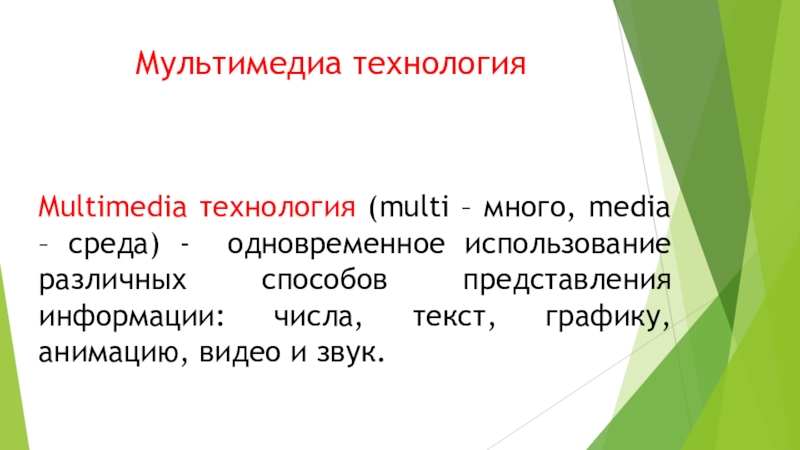 одновременное использование различных способов представления информации: числа, текст, графику, анимацию, видео и звук.