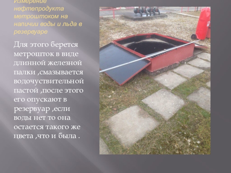 Слайд 3Измерение нефтепродукта метроштоком на наличии воды и льда в резервуаре