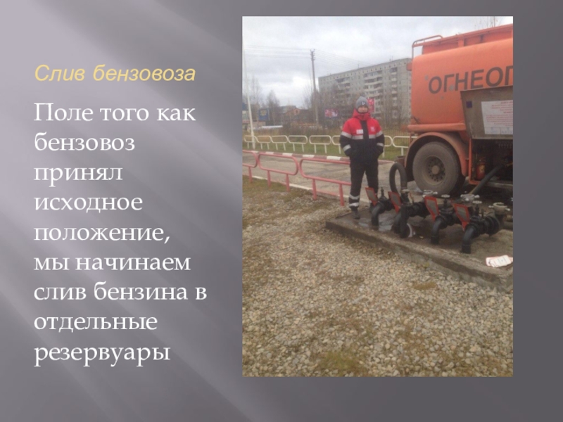 Слив бензовоза Поле того как бензовоз принял исходное положение, мы начинаем слив бензина в отдельные резервуары