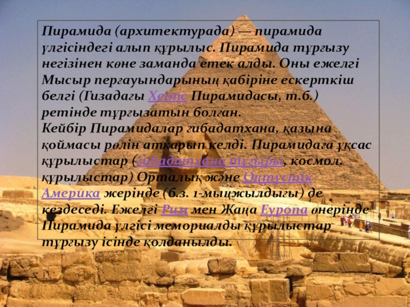Пирамида (архитектурада) — пирамида үлгісіндегі алып құрылыс. Пирамида тұрғызу негізінен көне заманда етек алды. Оны ежелгі Мысыр перғауындарының қабіріне ескерткіш белгі (Гизадағы Хеопс Пирамидасы, т.б.) ретінде тұрғызатын болған.