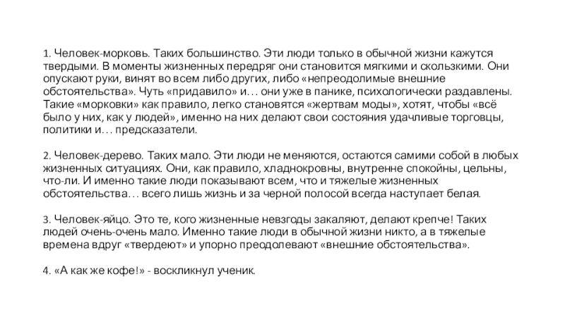 обстоятельства. Морковка, дерево, яйцо и кофе – это типы людей. Они все в тяжелые моменты жизни меняются по разному.