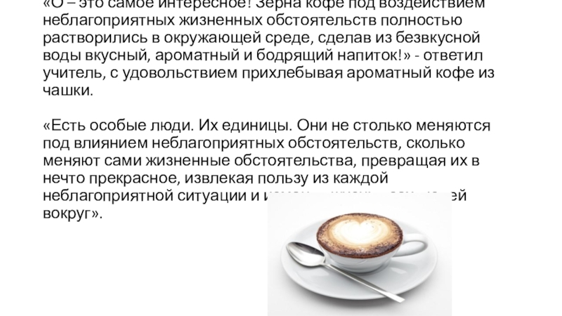 обстоятельств полностью растворились в окружающей среде, сделав из безвкусной воды вкусный, ароматный и бодрящий напиток!» - ответил учитель, с удовольствием прихлебывая ароматный кофе из чашки.