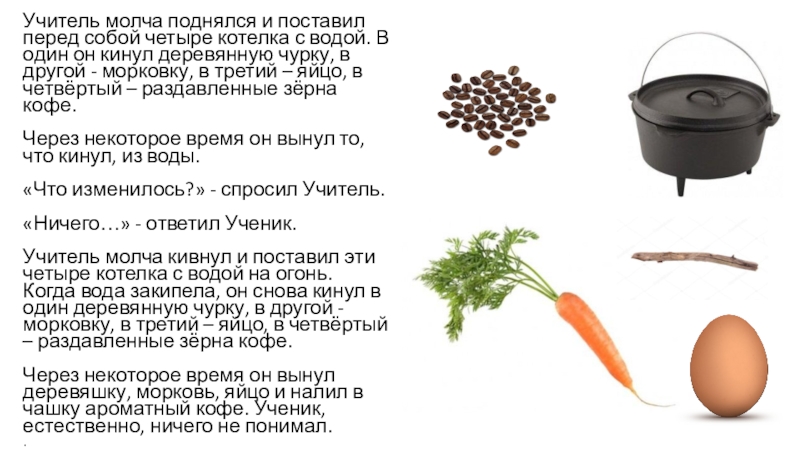 Учитель молча кивнул и поставил эти четыре котелка с водой на огонь. Когда вода закипела, он снова кинул в один деревянную чурку, в другой - морковку, в третий – яйцо, в четвёртый – раздавленные зёрна кофе.