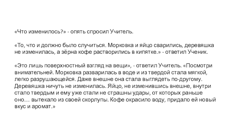 «Это лишь поверхностный взгляд на вещи», - ответил Учитель. «Посмотри внимательней. Морковка разварилась в воде и из твердой стала мягкой, легко разрушающейся. Даже внешне она стала выглядеть по-другому. Деревяшка ничуть не изменилась. Яйцо, не изменившись внешне, внутри стало твердым и ему уже стали не страшны удары, от которых раньше оно… вытекало из своей скорлупы. Кофе окрасило воду, придало ей новый вкус и аромат.»