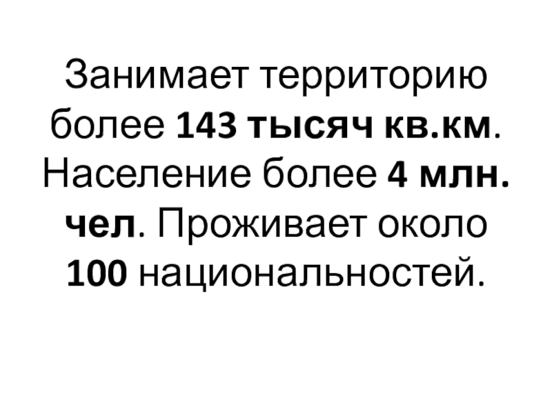 Слайд 12Занимает территорию более 143 тысяч кв.км. Население более 4 млн. чел.