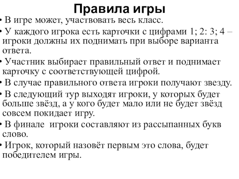 Правила игры В игре может, участвовать весь класс. У каждого игрока есть карточки с цифрами 1; 2: 3; 4 – игроки должны их поднимать при выборе варианта ответа. Участник выбирает правильный ответ и поднимает карточку с