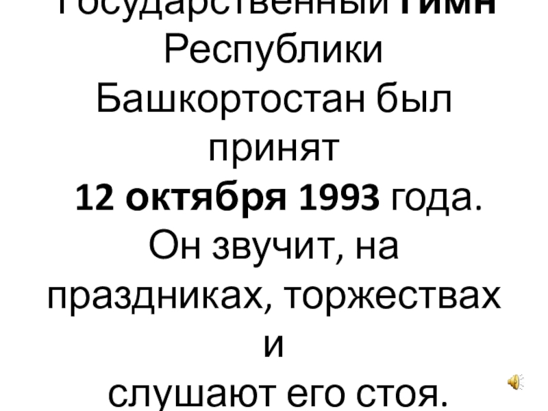 Слайд 23 Государственный гимн Республики Башкортостан был принят 12 октября 1993 года. Он