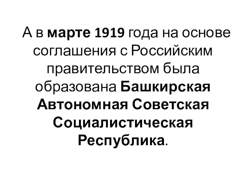 А в марте 1919 года на основе соглашения с Российским правительством была образована Башкирская Автономная Советская