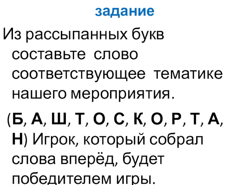 заданиеИз рассыпанных букв составьте слово соответствующее тематике нашего мероприятия. (Б, А, Ш, Т, О, С, К,