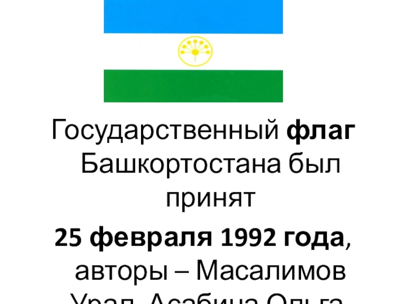 Государственный флаг Башкортостана был принят 25 февраля 1992 года, авторы – Масалимов Урал, Асабина Ольга.