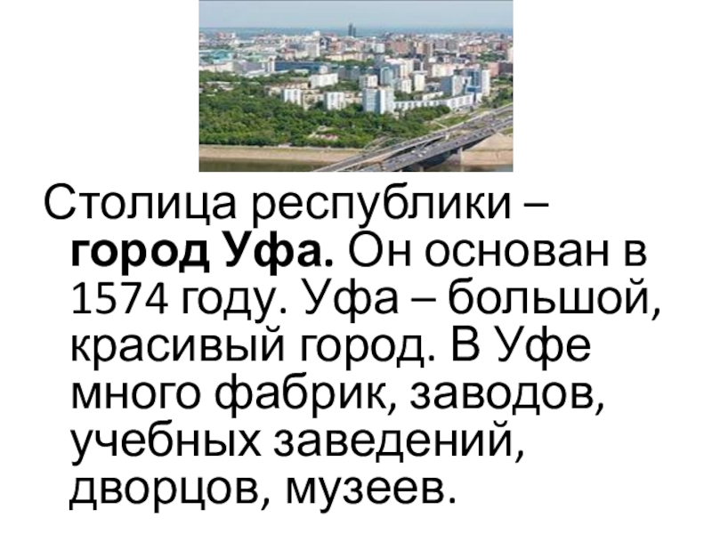 Столица республики – город Уфа. Он основан в 1574 году. Уфа – большой, красивый город. В Уфе