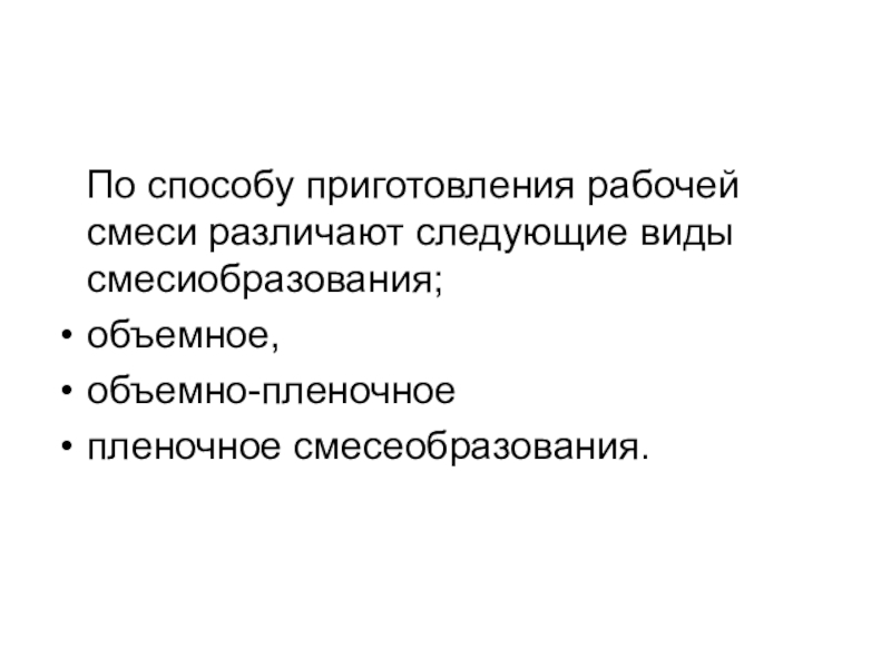 По способу приготовления рабочей смеси различают следующие виды смесиобразования;объемное, объемно-пленочное пленочное смесеобразования.