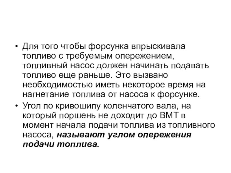 Угол по кривошипу коленчатого вала, на который поршень не доходит до ВМТ в момент начала подачи топлива из топливного насоса, называют углом опережения подачи топлива.