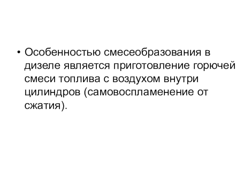 Особенностью смесеобразования в дизеле является приготовление горючей смеси топлива с воздухом внутри цилиндров (самовоспламенение от сжатия).
