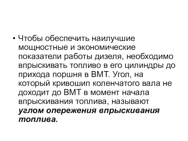 Чтобы обеспечить наилучшие мощностные и экономические показатели работы дизеля, необходимо впрыскивать топливо в его цилиндры до прихода