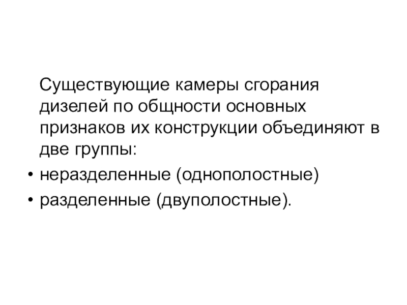 Существующие камеры сгорания дизелей по общности основных признаков их конструкции объединяют в две группы: неразделенные