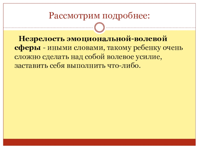 Рассмотрим подробнее:	Незрелость эмоциональной-волевой сферы - иными словами, такому ребенку очень сложно сделать над собой волевое усилие, заставить