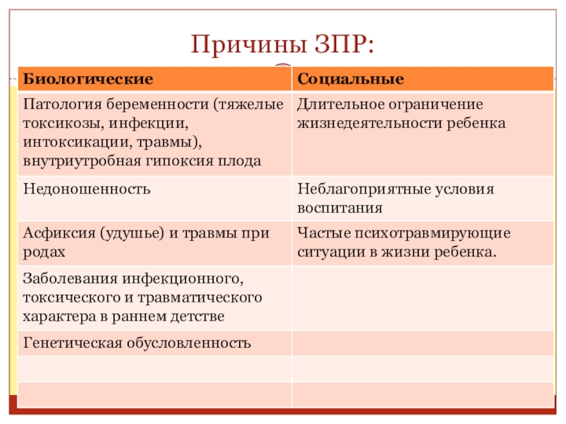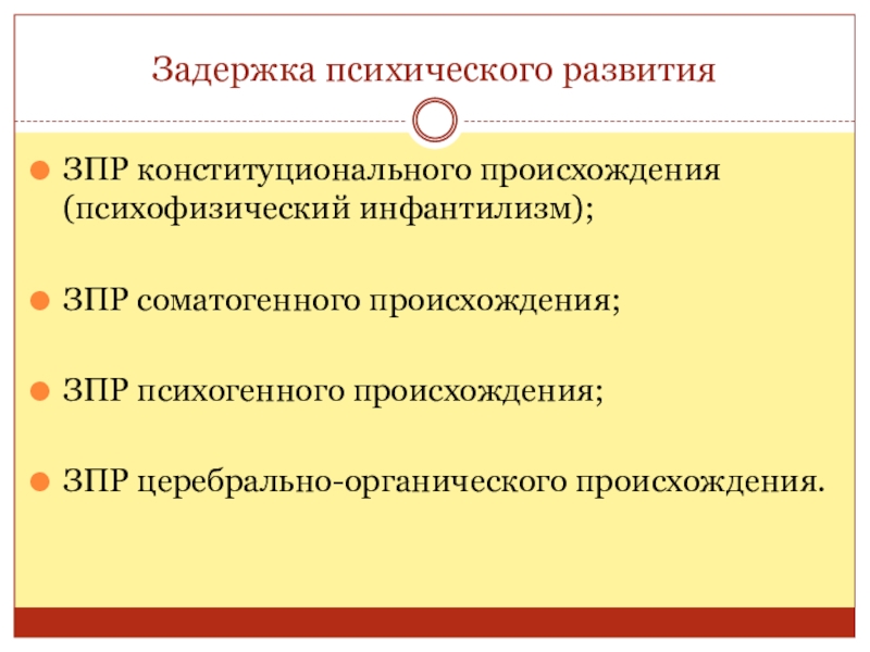 Задержка психического развитияЗПР конституционального происхождения (психофизический инфантилизм);ЗПР соматогенного происхождения;ЗПР психогенного происхождения;ЗПР церебрально-органического происхождения.