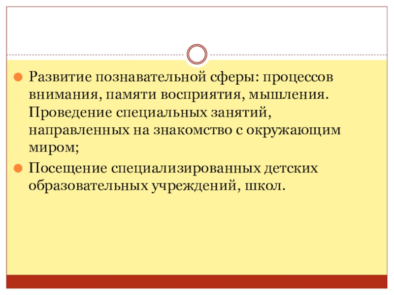 Развитие познавательной сферы: процессов внимания, памяти восприятия, мышления. Проведение специальных занятий, направленных на знакомство с окружающим миром;Посещение