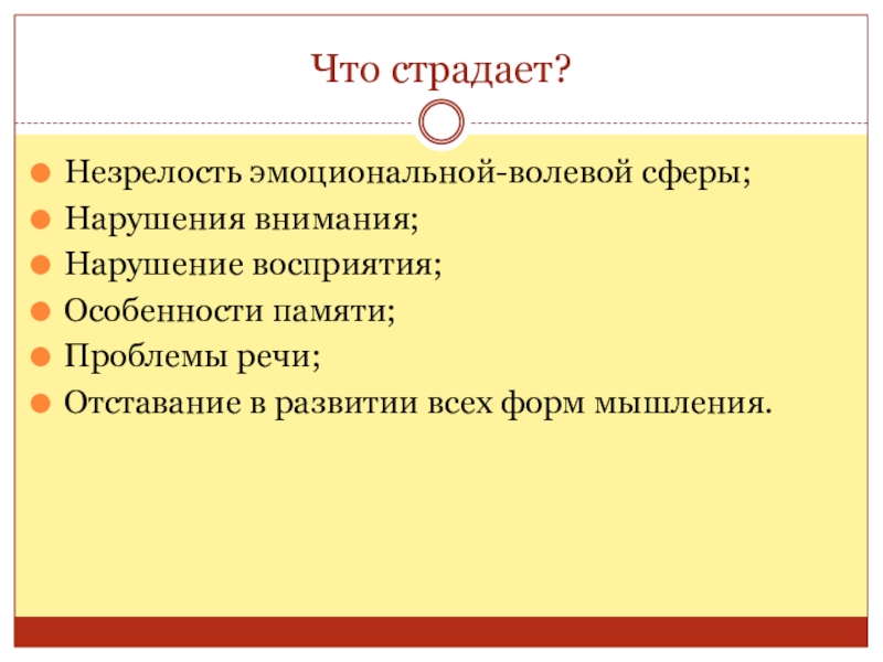Что страдает?Незрелость эмоциональной-волевой сферы;Нарушения внимания;Нарушение восприятия;Особенности памяти;Проблемы речи;Отставание в развитии всех форм мышления.