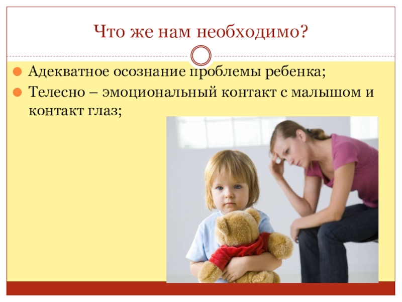 Что же нам необходимо?Адекватное осознание проблемы ребенка;Телесно – эмоциональный контакт с малышом и контакт глаз;