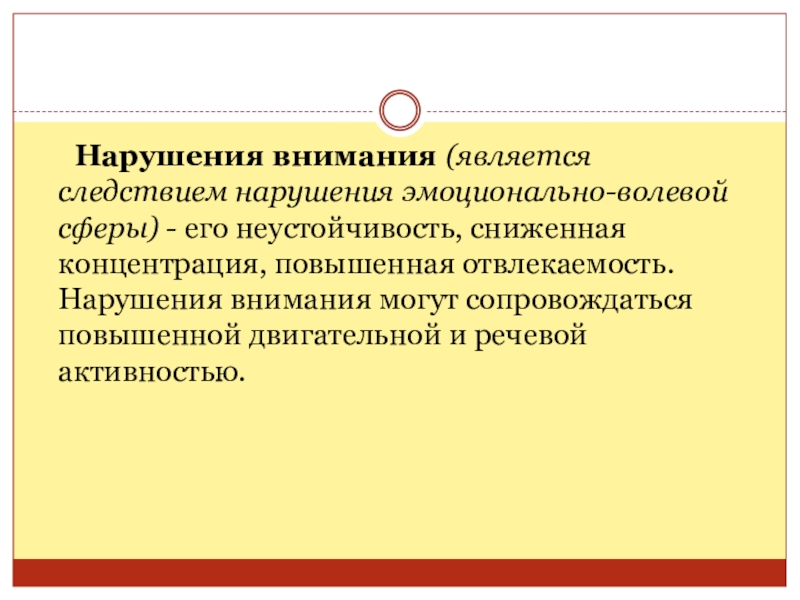 Слайд 8 Нарушения внимания (является следствием нарушения эмоционально-волевой сферы) - его неустойчивость, сниженная